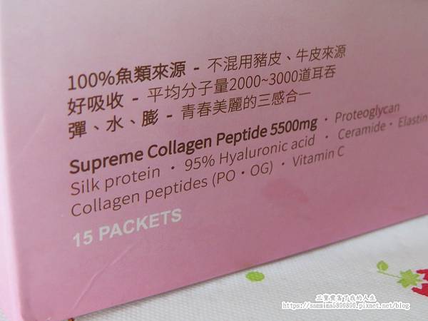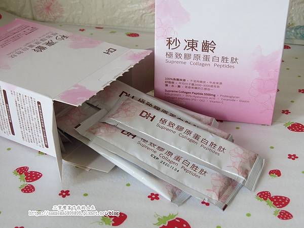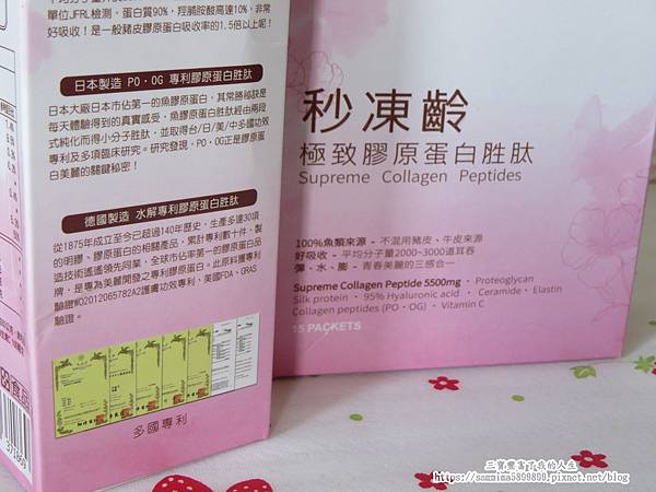 “秒凍齡極致膠原蛋白胜肽”有著粉色的外盒,盒上有著清楚的產品介紹,