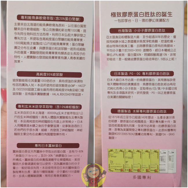 專利鮭魚鼻軟骨萃取(20%蛋白聚糖)、專利玄米萃取(10%賽洛美)、高純度95%透明質酸納、小分子彈力蛋白、專利蠶絲蛋白、維生素C