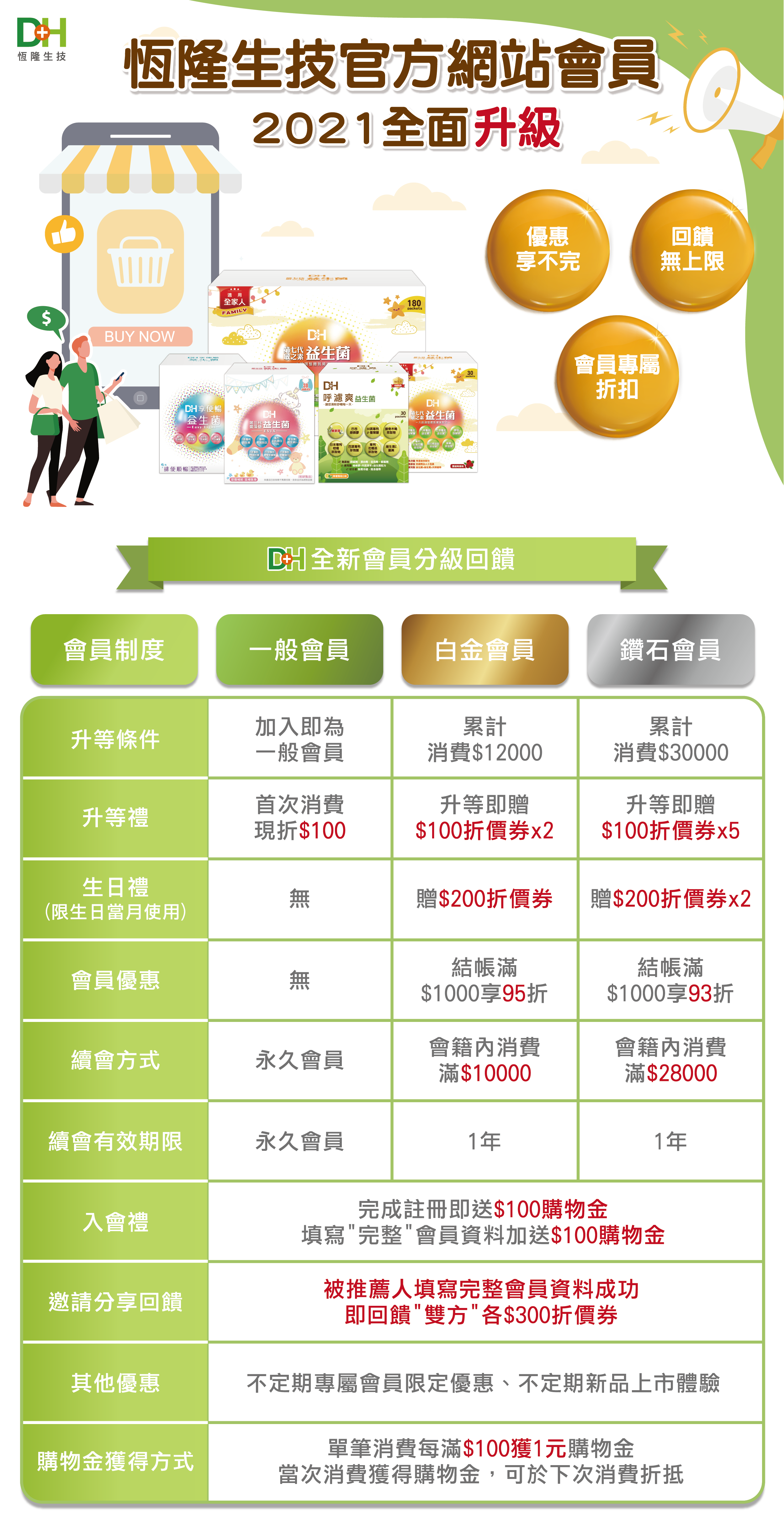 - 即日加入恆隆生技網站會員,即贈購物金100元折價券,單次消費不限金額即可使用(使用期限為30天)