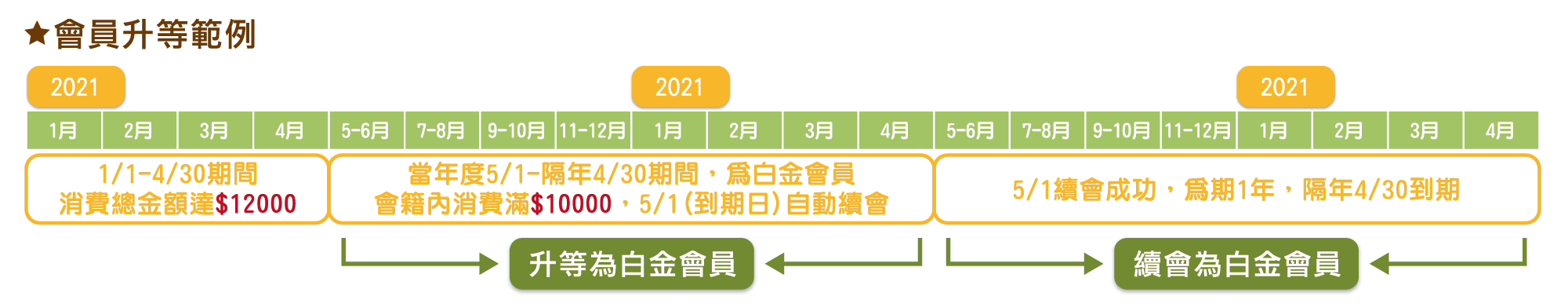 - *當原會籍到期未達續會或升等門檻,則自到期日隔日自動降成一般會員