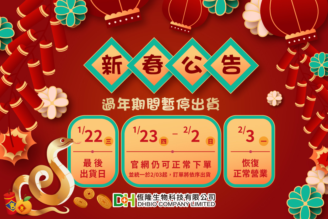 新春公告-過年期間暫停出貨 為配合過年假期,我們將於 1/23(四)至 2/2(日)暫停出貨,歡迎至各大實體藥局通路購買,官網仍可正常下單,訂單將依序出貨。 Read More » dhbio 2025-01-10