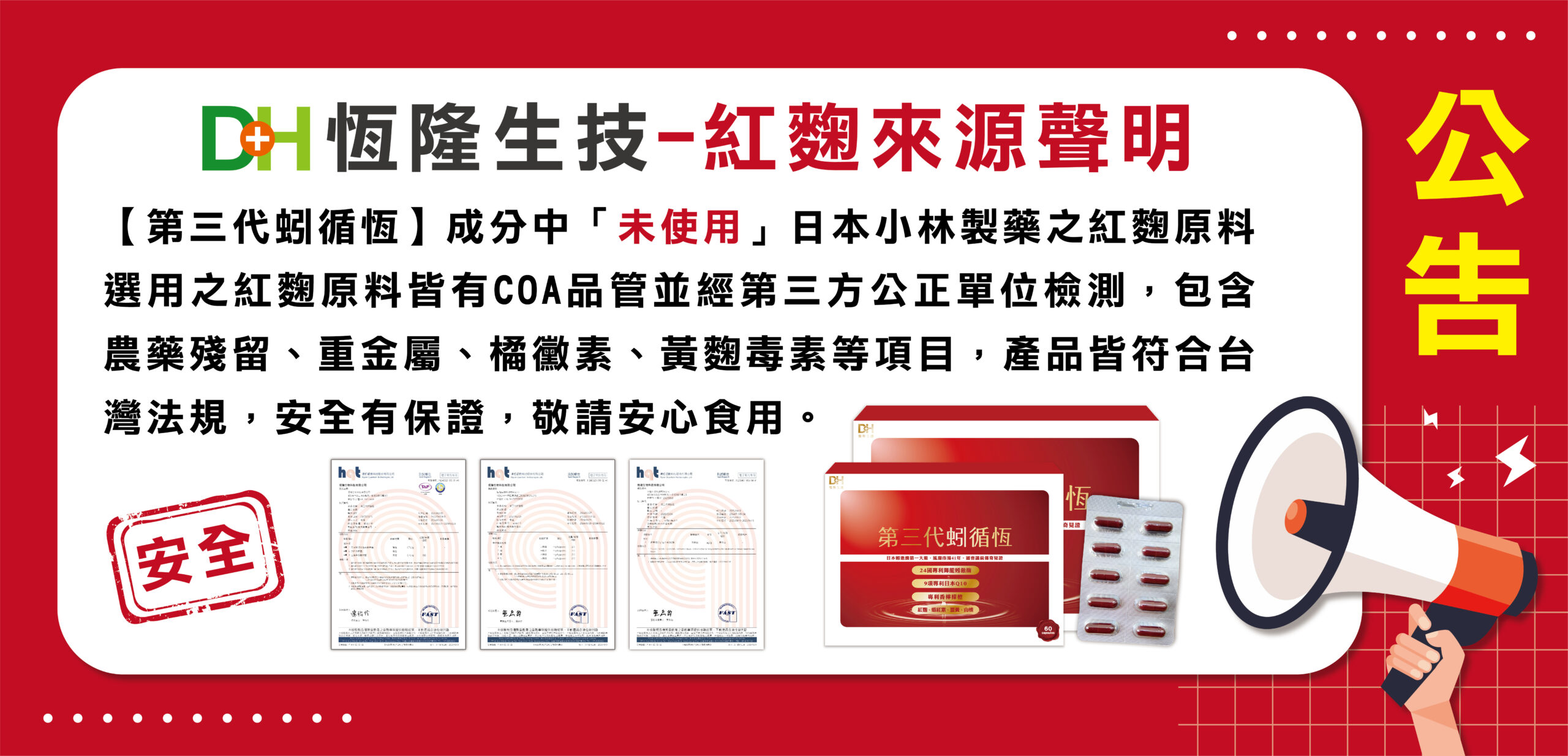 第三代蚓循恆-紅麴來源聲明 【 第三代蚓循恆】成分中「 未使用」日本小林製藥之紅麴原料,選用之紅麴原料皆有COA品管並經第三方公正單位檢測,包含農藥殘留、重金屬、麴黴素、黃麴毒素等項目,產品皆符合台灣法規,安全有保證,敬請安心食用。 Read More » dhbio 2024-04-02