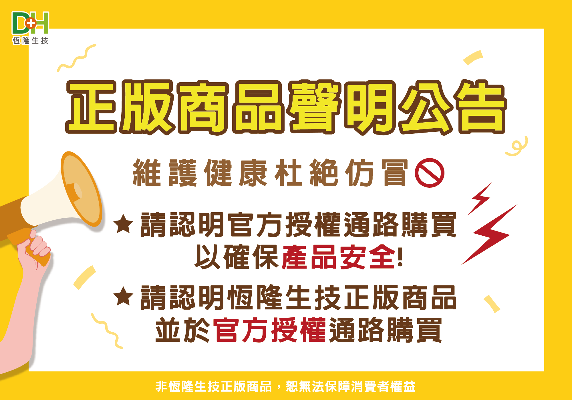恆隆生技正版商品聲明公告 請認明官方授權通路購買,以確保產品安全! 近來發現不肖業者販售恆隆生技產品 為了您的健康與保障自身權利,請勿購買一頁式網站、售價過低、備貨期過長等來源不明的產品 Read More » dhbio 2021-09-15
